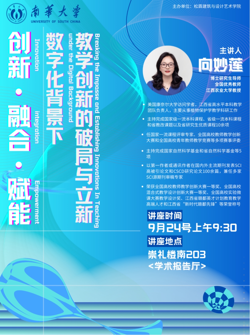 9月24日,南华大学松霖建筑与艺术设计学院成功举办“数字化背景下的教学创新”专题活动,特邀全国教学名师、江西农业大学向妙莲教授主讲和指导。