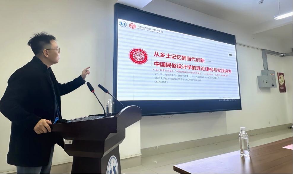 2025年10月21日,严康博士应邀来松霖建筑与设计艺术学院作“从乡土记忆到当代创新 —— 中国民俗设计学的理论建构与实践探索”专题讲座。讲座由学院院长姚湘主持,师生代表共100余人参与。