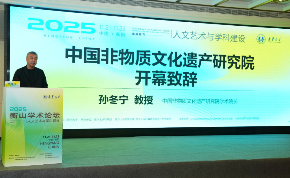 中国非物质文化遗产研究院学术院长孙冬宁教授致辞并主持了22号上午的学术论坛。他强调应合力搭建一个高水平的对话平台,共同探讨在新时代环境中,如何巩固人文艺术学科的基石地位,推动其创造性转化与创新性发展,如何促进跨学科的交汇与碰撞,催生新的学术增长点,如何让人文艺术的精神滋养、渗透到所有学科的肌理之中,培养出兼具科学精神与人文素养、专业能力与审美情怀的卓越人才。南华大学松霖建筑与设计艺术学院院长姚湘教授代表承办单位表示感谢并致辞。