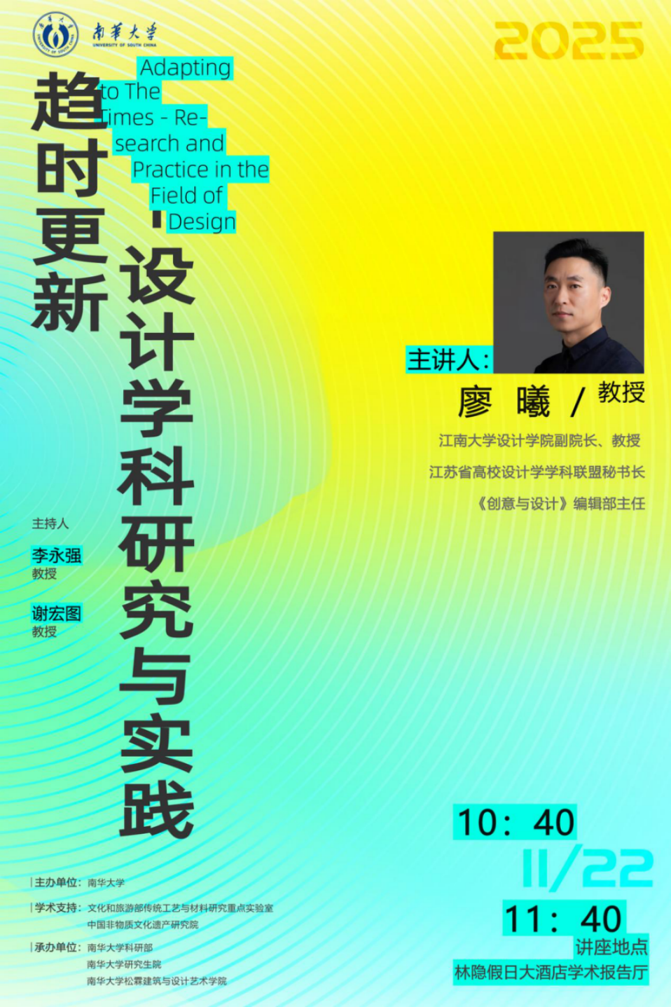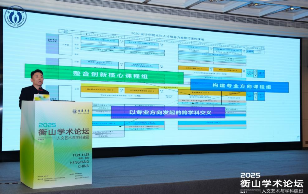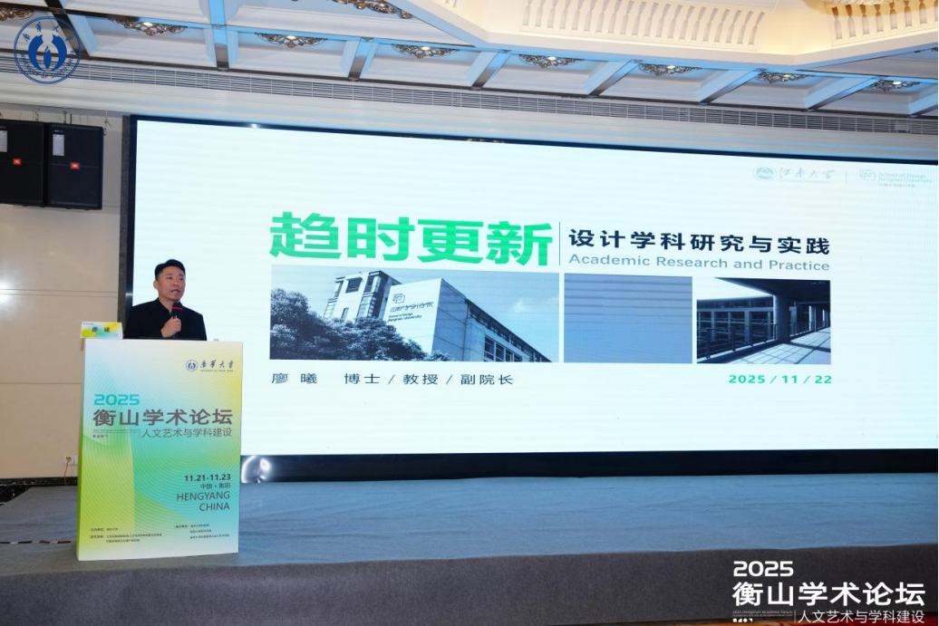 2025年11月22日,2025衡山学术论坛暨人文艺术与学科建设大会在衡阳市林隐酒店召开。本次论坛由南华大学主办,研究生院、科研部与松霖建筑与设计艺术学院共同承办。江南大学设计学院廖曦教授应邀作《趋时更新——设计学科研究与实践》专题讲座。讲座由广西艺术学院中国画学院院长李永强教授主持,线上线下参与总人数逾两千人。