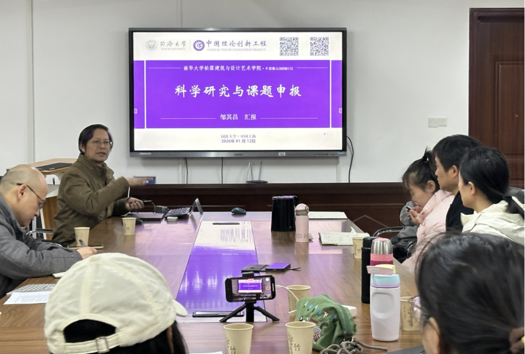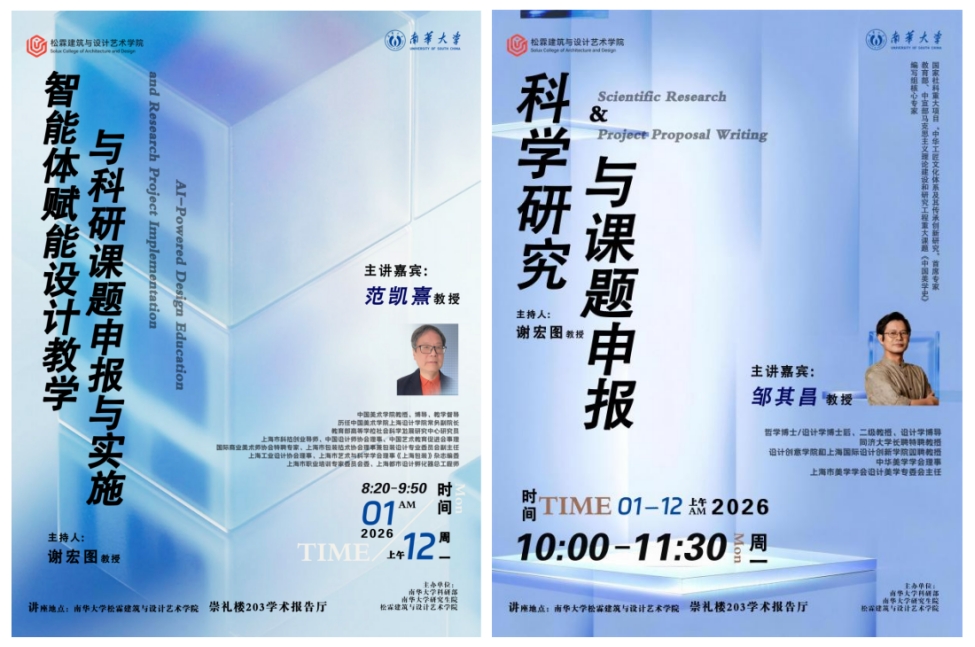 2026年1月12日,中国美术学院范凯熹教授与同济大学邹其昌教授应邀来访,为南华大学松霖设计学院师生作“科学研究与课题申报”专题讲座。讲座由院党委书记谢宏图教授主持,学院科研骨干教师及研究生参加。